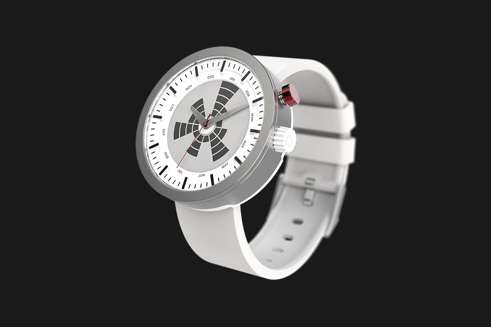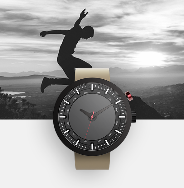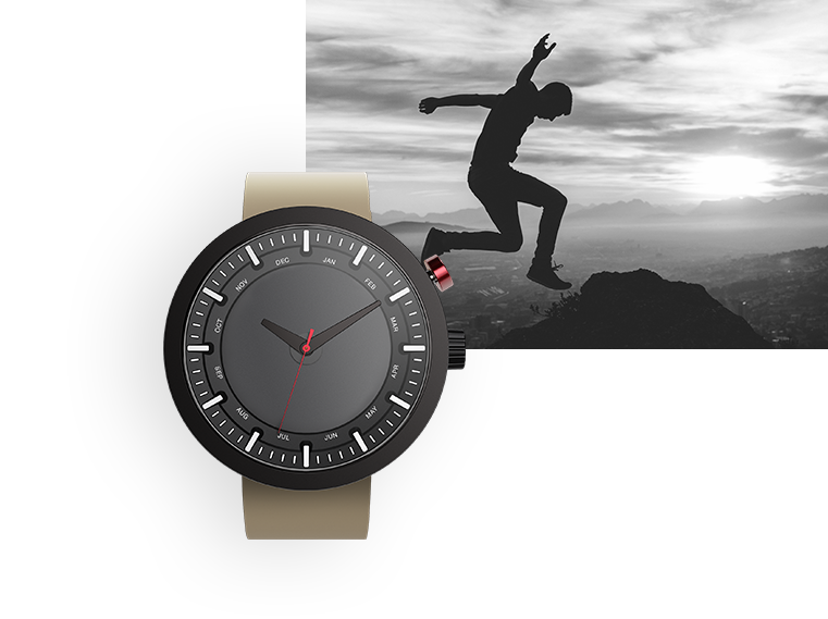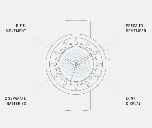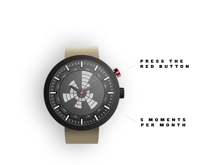 … stop the time with What? Watch and help the moment to live on. By pressing the red button, you create a visible memory mark on the watch face that allows you to reflect on that moment everytime you glance at your watch. Organized by month, these marks create the unique pattern of moments in your life, visible throughout the whole year.